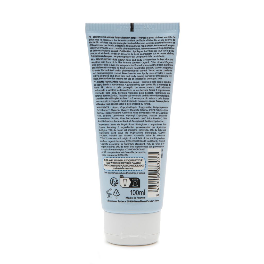 Cette crème hydratante fluide visage et corps permet d’hydrater la peau sèche et sensible de bébé dès la naissance. La formule contient de l’huile d’Olive Bio et du beurre de Karité Bio et laisse la peau protégée du desséchement, apaisée des tiraillements et délicatement parfumée. Sa texture fluide pénètre rapidement.