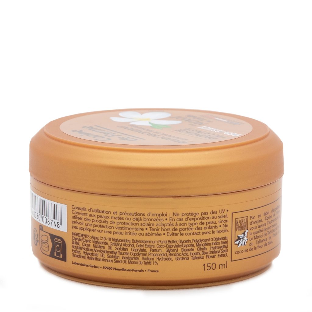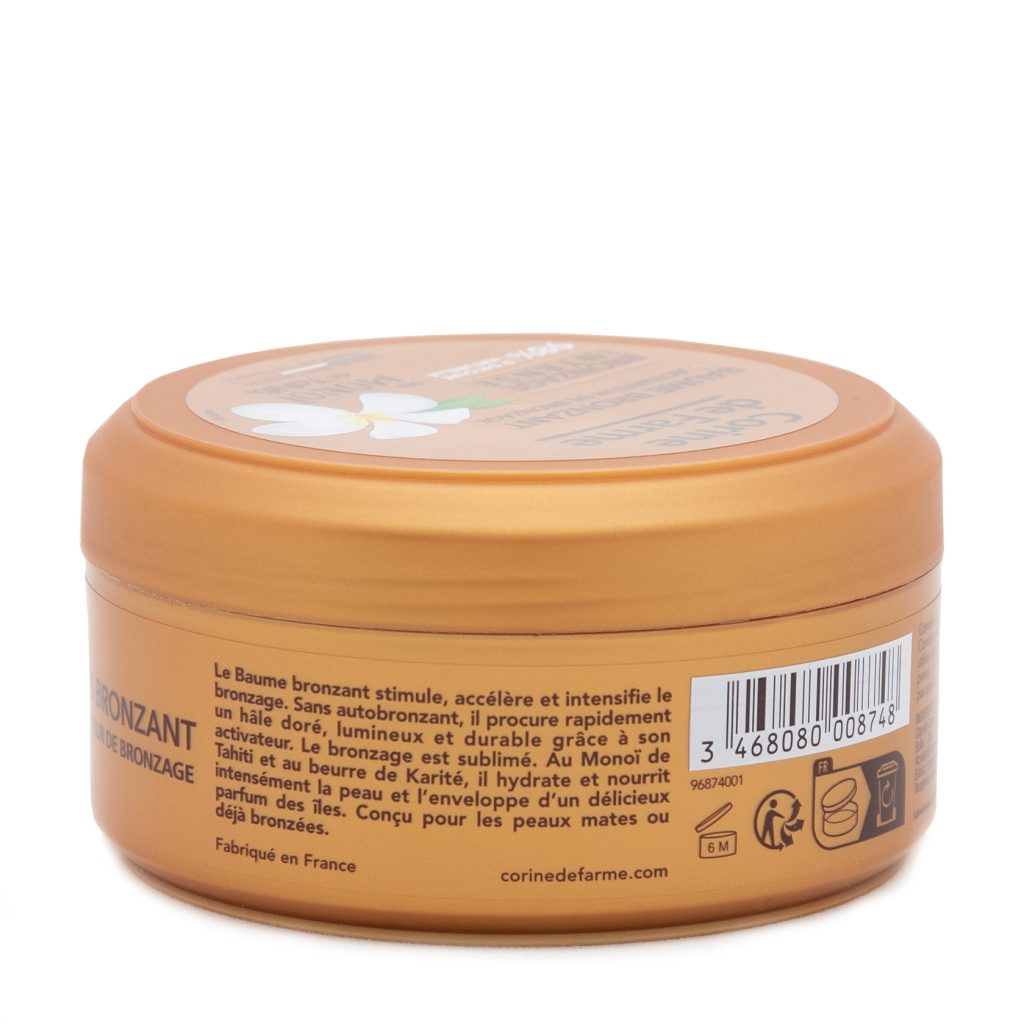 Le Baume bronzant est une émulsion qui stimule, accélère et intensifie le bronzage grâce à son activateur de bronzage. Il procure rapidement à la peau un hâle doré, lumineux et durable, sans agent autobronzant. Le bronzage est sublimé. Le Baume bronzant contient du Monoï de Tahiti et du beurre de Karité. Il hydrate et nourrit intensément la peau, tout en l’enveloppant d’un délicieux parfum des îles. Son usage est prévu pour les peaux mates ou déjà bronzées.