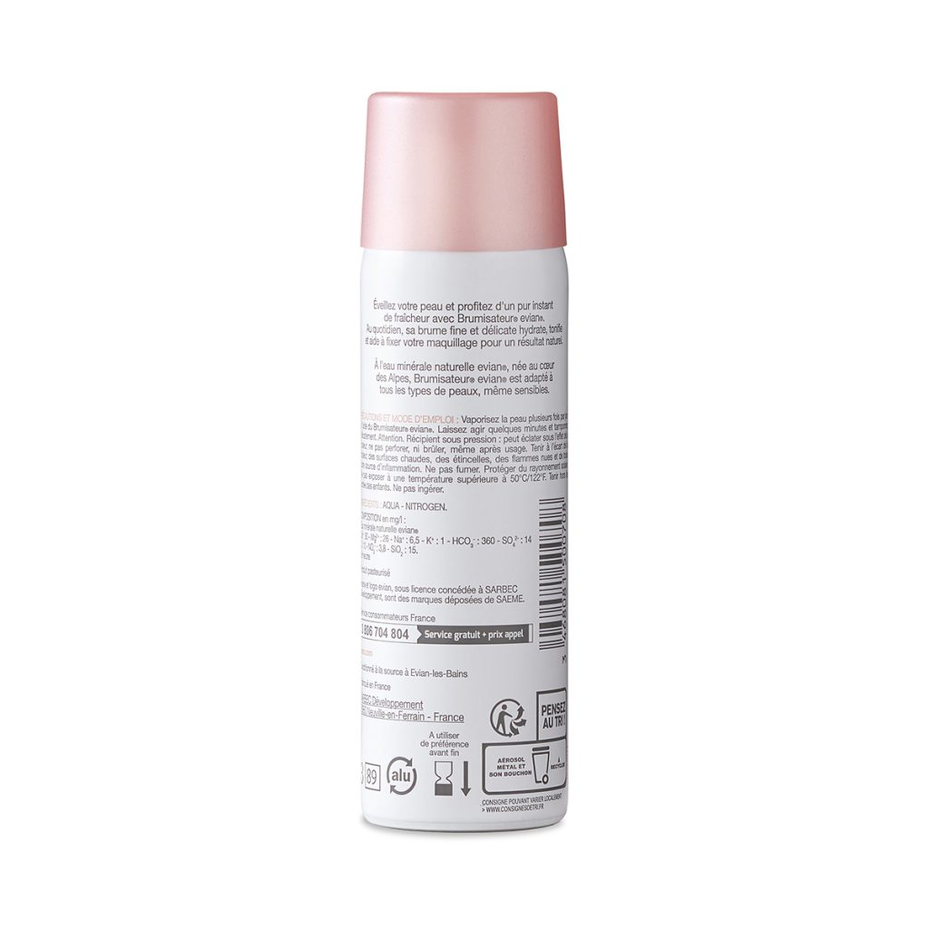 - Brumisateur® evian® 50ml est à emporter partout avec vous dans votre sac à main. Le format 50ml est accepté dans les cabines en avion pour un instant de détente et de fraîcheur !