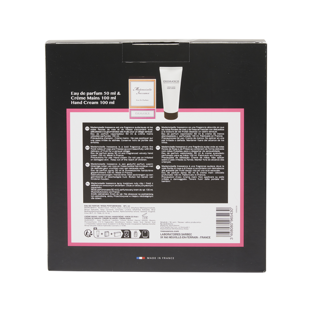 Le coffret Mademoiselle Inessance contient une Eau de Parfum 50ml et une Crème Mains 100ml :