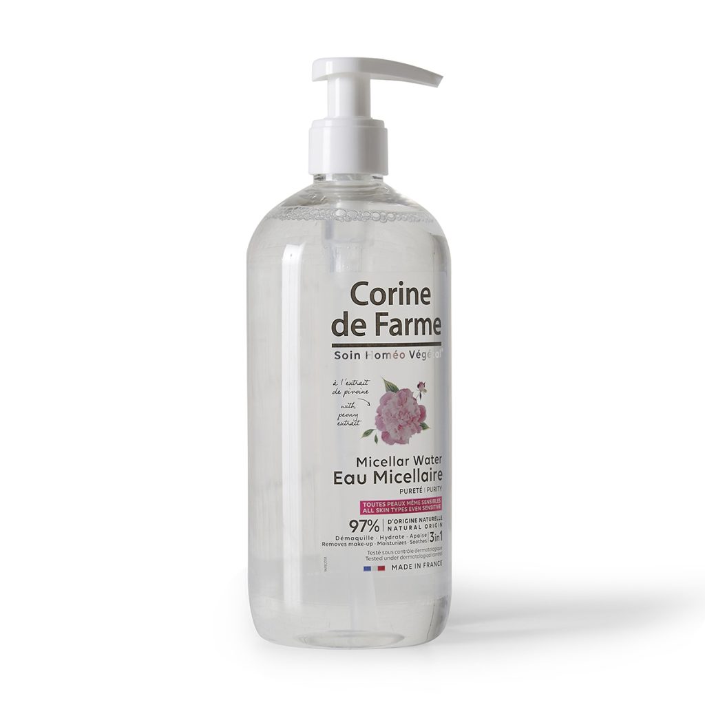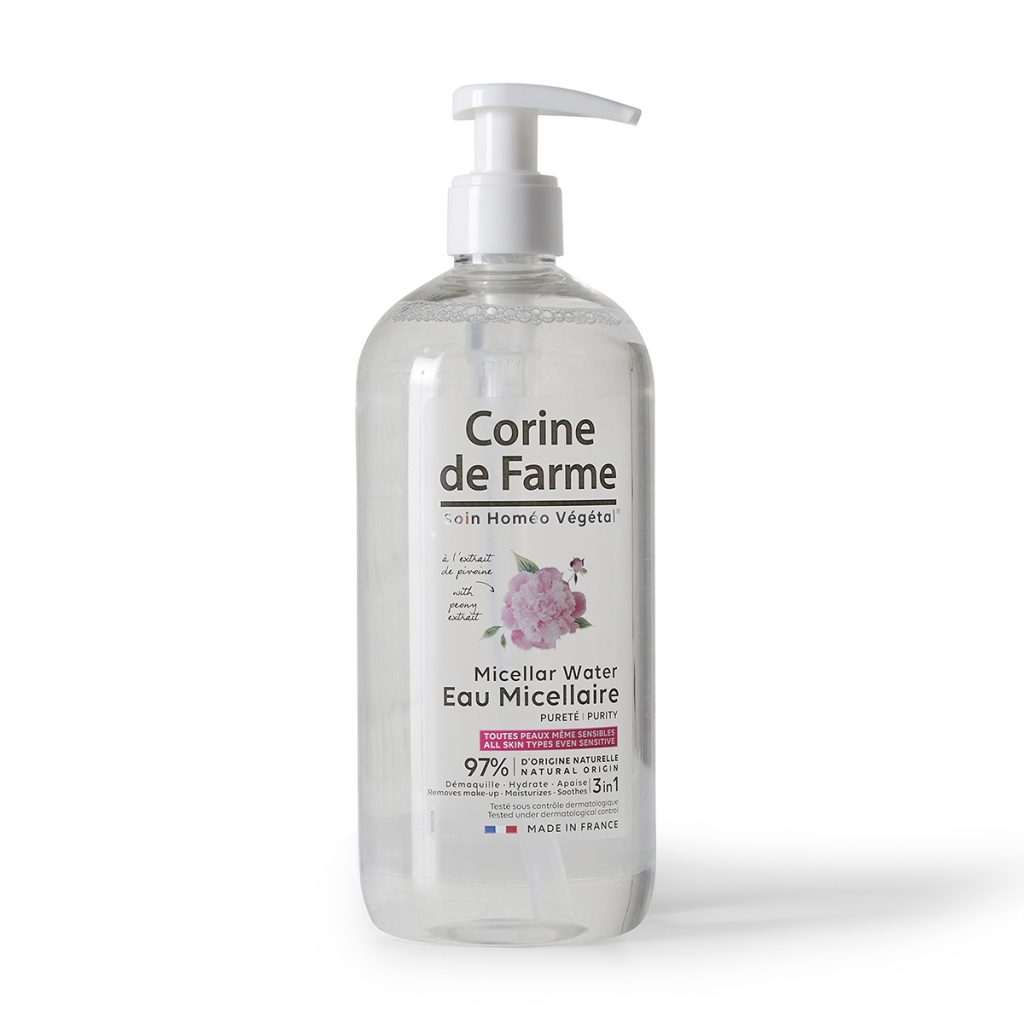 " Les formules micellaires Corine de Farme sont constituées de micelles, tensio-actifs organisés en sphères actives capables de piéger les impuretés présentes à la surface de l'épiderme pour un démaquillage parfait du visage et des yeux, même sur les maquillages résistants. "