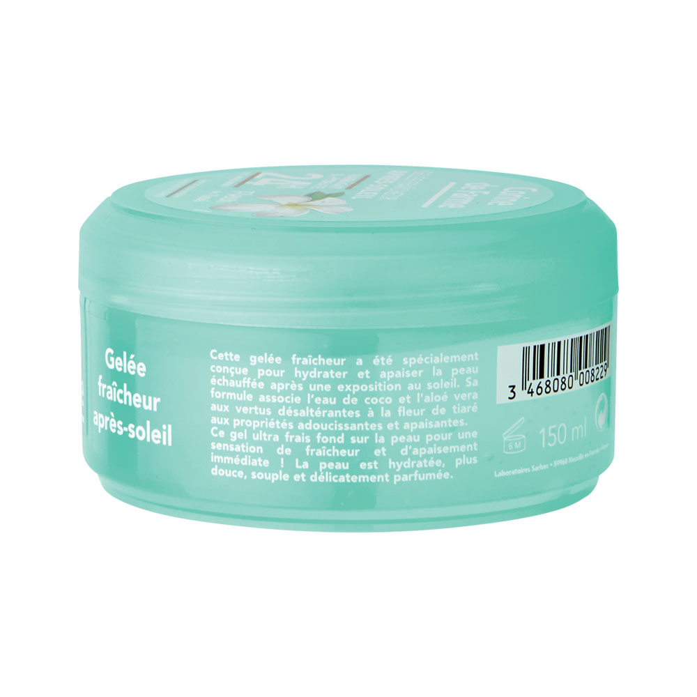 Cette gelée a été spécialement conçue pour hydrater et apaiser la peau échauffée après une exposition au soleil. Sa formule associe l’eau de coco et l’aloé vera aux vertus désaltérantes à la fleur de tiaré aux propriétés adoucissantes et apaisantes.Ce gel ultra frais fond sur la peau pour une sensation de fraîcheur et d’apaisement immédiate. la peau est hydratée, plus souple, douce et délicatement parfumée.