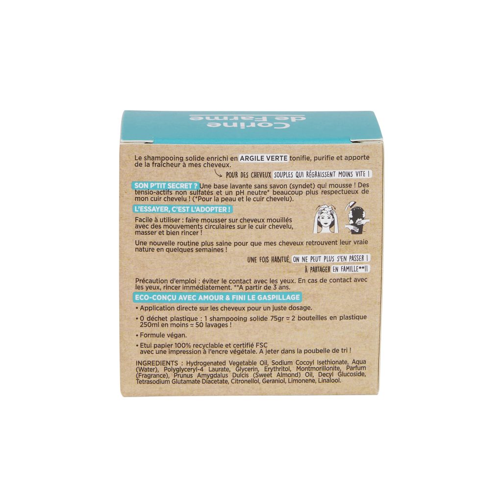 Sa formule, éco-conçue avec amour et enrichie en Argile Verte, tonifie, purifie et apporte de la fraîcheur aux cheveux.